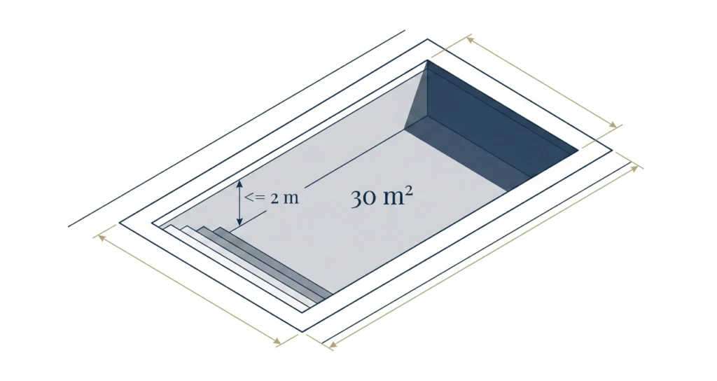 1. Wanneer ben ik vrijgesteld van een vergunning voor een zwembad? U bent vrijgesteld als de totale oppervlakte aan niet-overdekte constructies in uw zij- of achtertuin de 80 m² niet overschrijdt. Hierbij worden alle bestaande terrassen en vijvers meegeteld. Daarnaast moet het zwembad binnen 30 meter van de woning liggen en op minstens 1 meter van de perceelsgrens blijven.